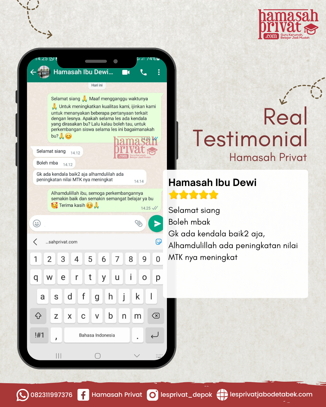 Banyak orang tua dan siswa telah mempercayakan pendidikan mereka kepada Hamasah Privat. Testimoni positif yang kami terima menjadi bukti bahwa metode pembelajaran yang efektif, tutor yang kompeten, serta pendampingan yang sabar mampu membantu meningkatkan pemahaman dan prestasi belajar siswa